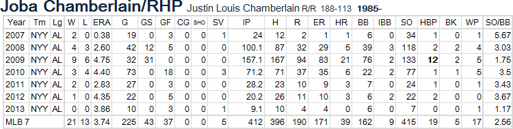 ジョバ・チェンバレンはここ数年、リベラとともに救援陣を担っている。しかし、彼はリベラの優秀な生徒とは言えない。100マイル超の豪速球はトミー・ジョン手術後は鳴りを潜めている。いまは95マイル前後の速球にカーブ、スライダーを交えて投球を組み立てているが、制球は良くない。まかされた回を三者凡退で終わることは少ない。今シーズンもここまでERAは4.00。WHIPも1.60。救援投手としては失格の数字だ。