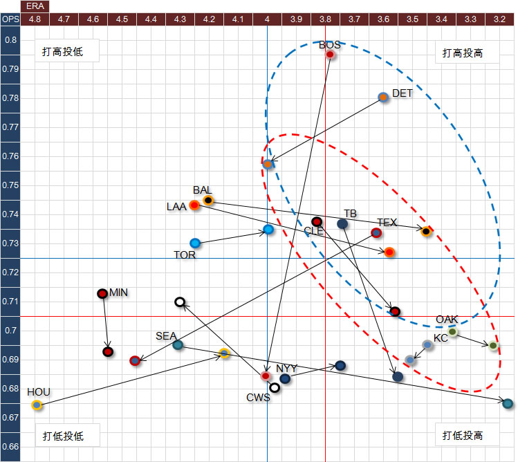 ヒューストン・アストロズ=HOUがまだ下位ながらもチーム状態を改善しているのに対し、テキサス・レンジャーズはチーム力を下げ、入れ替わったこともこのマトリクスからわかる。