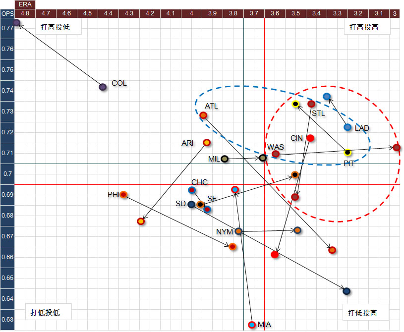 アリーグと同様、各球団の投打のバランスは一定の方向ではなく、さまざまに飛び散っているが、OPSが落ちてERAが上昇している球団が多い。