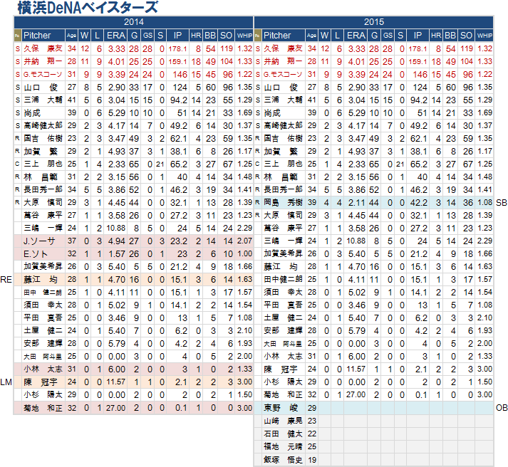 1年働いては沈んでいく投手ばかり。三浦が一人で踏ん張っていたが、その番長にも陰りが見える。副番久保とともに踏ん張れる先発陣ができるか。