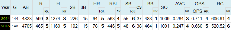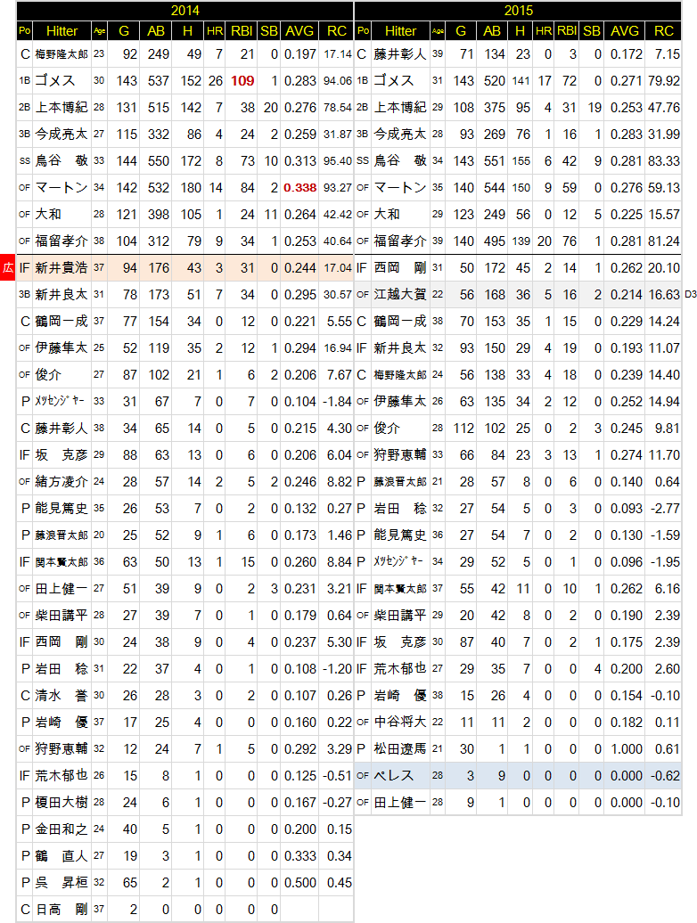 打撃成績 2014年と2015年の比較。ベージュは移籍選手。ブルーは加入選手。グレーは新人。