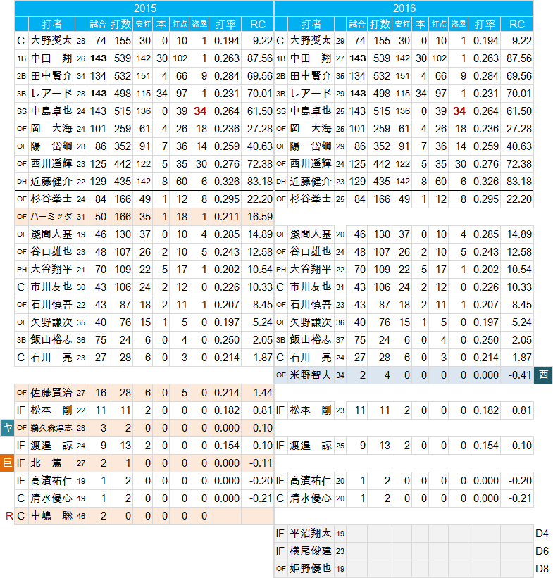 ただし問題もある。レギュラーの頭数は揃っており、余剰戦力を残していない点を好む人もいるかも知れませんが、リスク管理の観点からすると危ういチーム編成とも言えます。事実、昨年は故障した陽岱鋼の穴埋めに苦労しました。