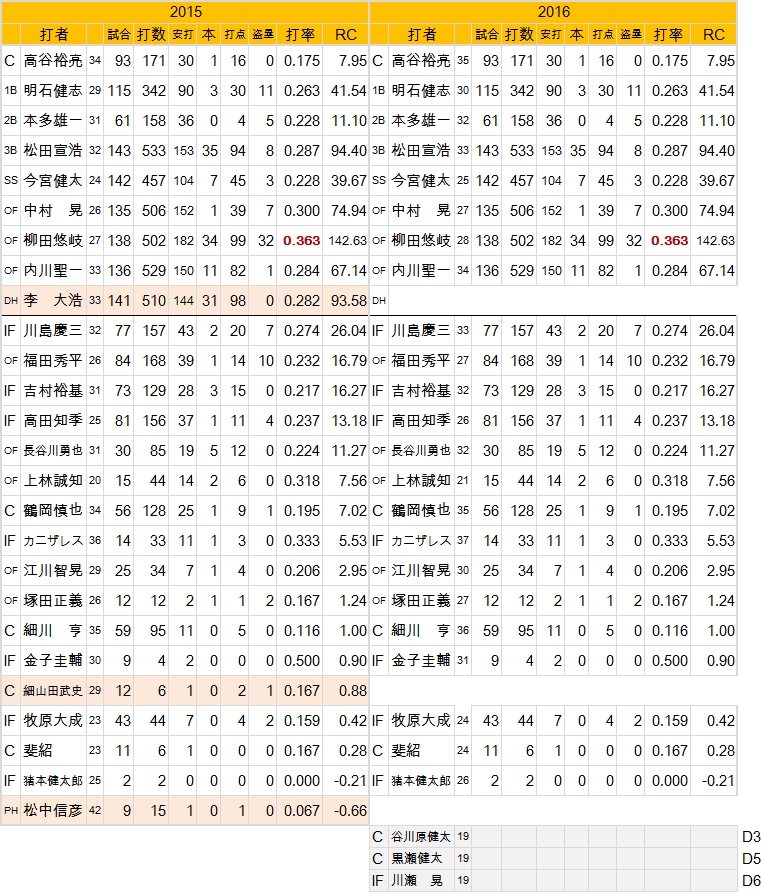 柳田悠岐がリーグ最強打者に成長。松田宣浩、李大浩と30本トリオを無。このオフは松田、李が、MLB挑戦を宣言。さすがに2門がなくなれば大事になるところだったが、松田は翻意。李大浩が抜けた。
