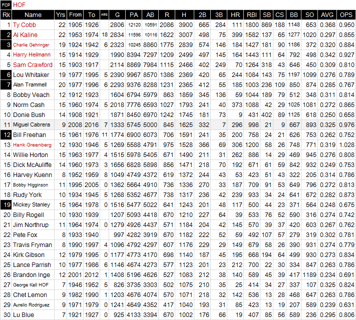 タイガースのフランチャイズ・プレイヤー、ケーラインにちなんで、デトロイト・タイガース安打数30傑。