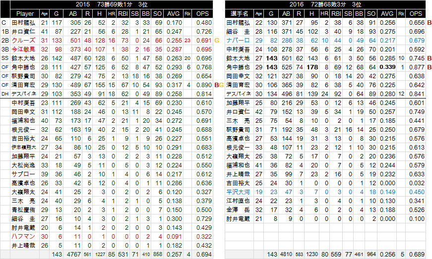 チーム打率は4位から5位、規定打席に達した選手は4人から3人。若干目減りした感がある。