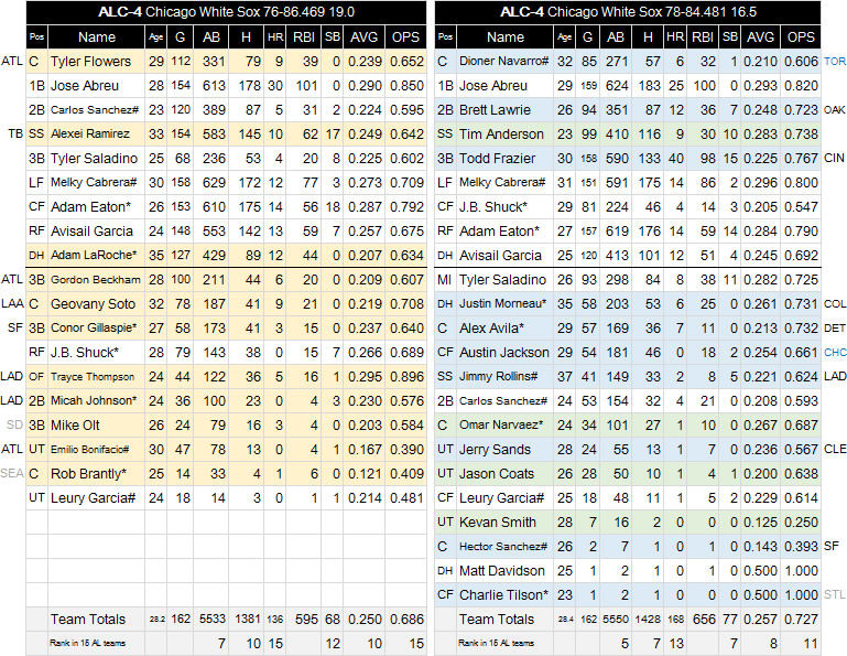 左が2015年の陣容、右が2016年、ベージュは移籍、ブルーは新加入。欄外の略称は移籍先、移籍元。薄緑は2016年、MLB初昇格。