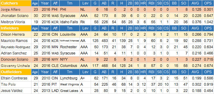 捕手のホルヘ・アルファロはまだ少しMLBの試合に出ただけだが、強打強肩の捕手としてつとに評判が高い。この選手が先発マスクだろう。