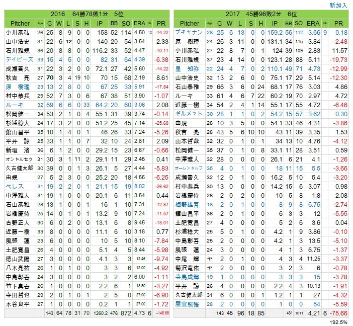 2015年にはバーネット、秋吉、ロマン、オンドルセクという「勝利の方程式」で優勝を飾ったが、これが翌年には瓦解、今年は秋吉がクローザーになったが戦線離脱。登板過多だろう。ルーキ、ついには小川が抑えに回ったが、スタッフ不足は否めなかった。
