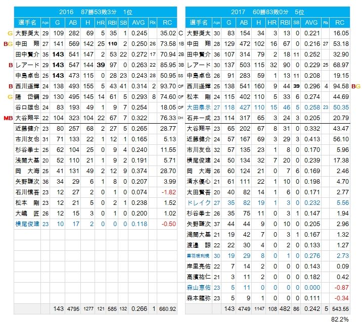 陽岱鋼が抜けた上に、2016年の優勝メンバーが軒並み成績が下落した。
