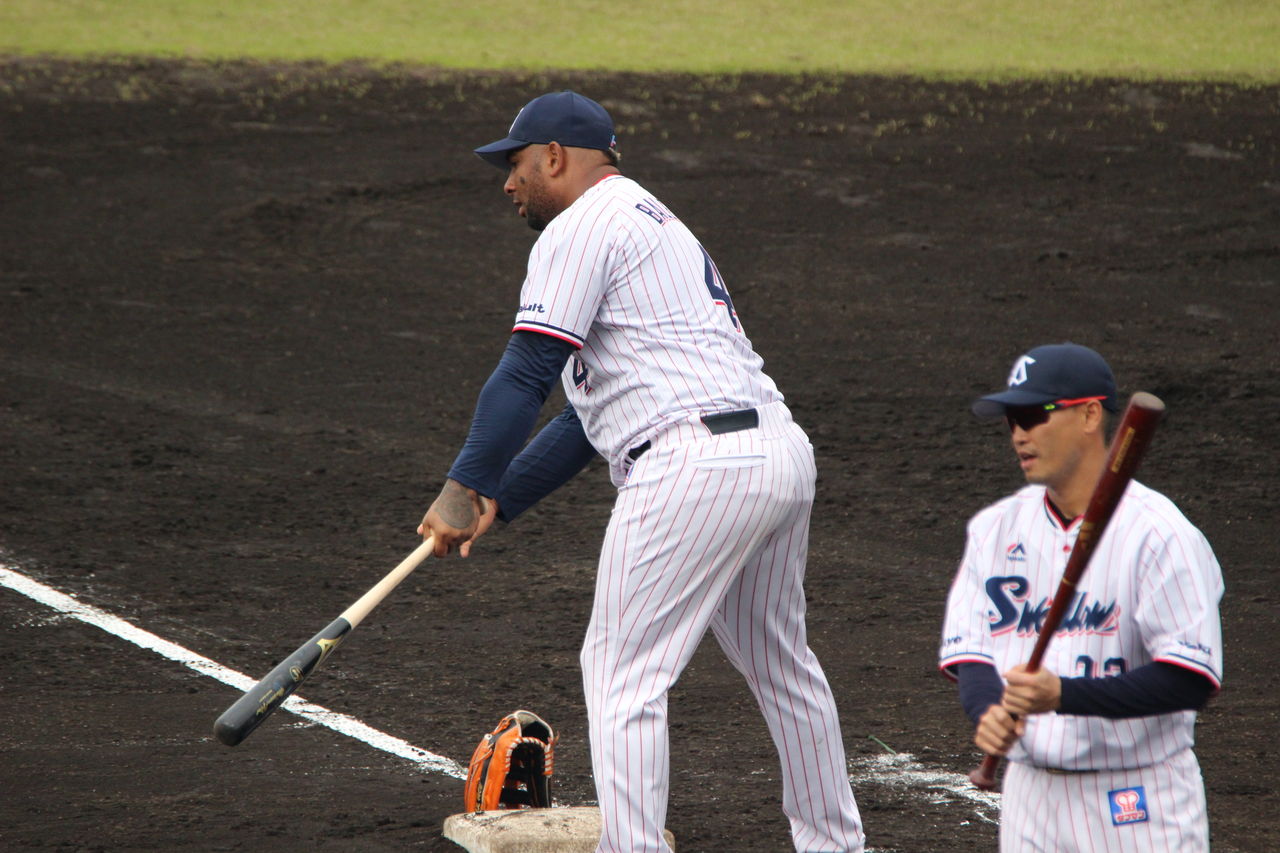 青木はバットにボールが吸い付くように打ち返しているが、バレンティンはへたくそである。何度も変な方向に打ち返して「わりいわりい」とやっていた。