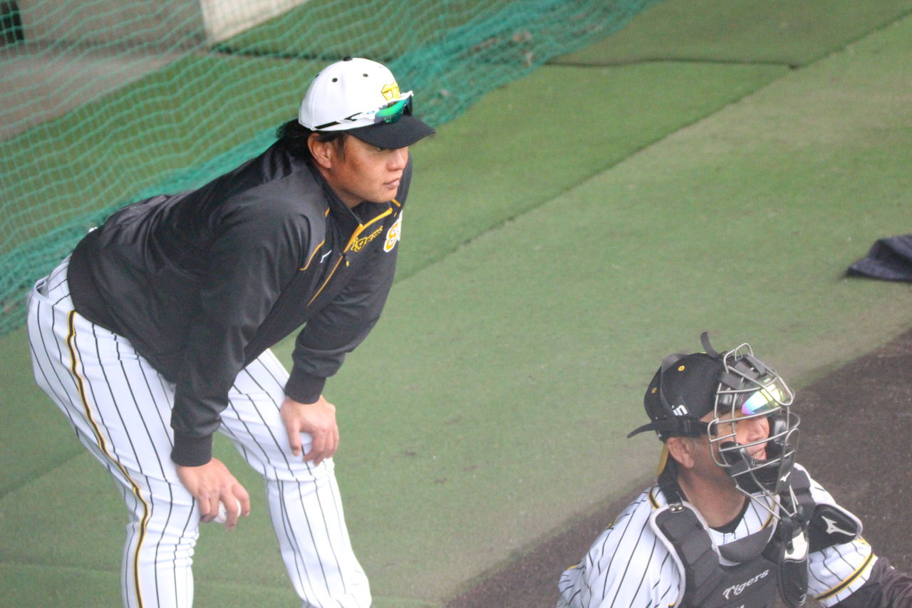 ブルペン捕手の後ろには福原忍コーチがいた。