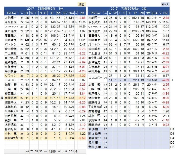 大和の人的補償で尾仲が阪神に移籍したのと、クラインとベテラン投手が退団した程度。