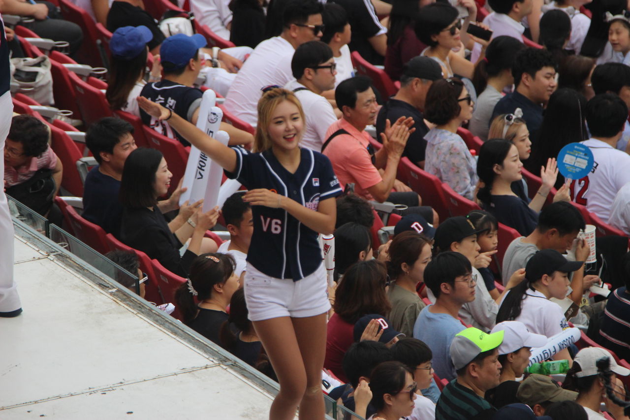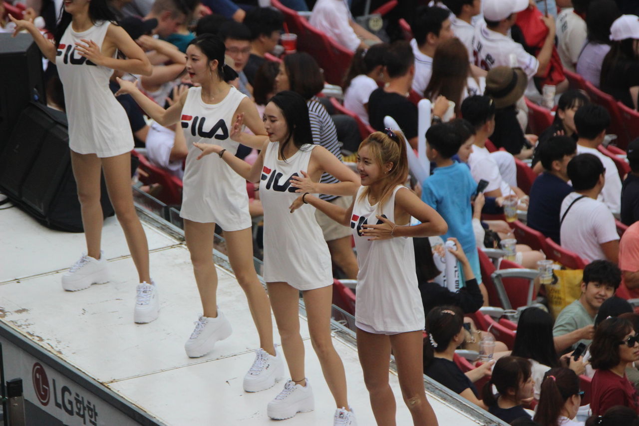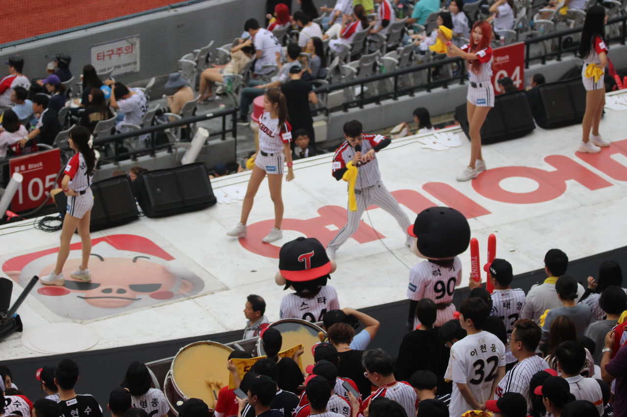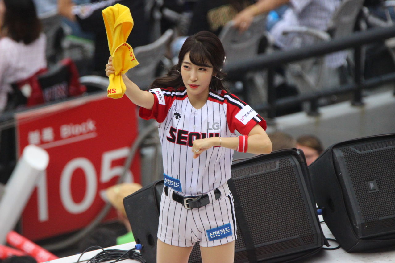 通常KBOの球場は、ホームチームだけがステージが設けられ、球団が運営するチアリーダーが登場する。ロードチームは、個人的な応援だけだが、チャムシルでは両チームともにステージがあって、チアリーダーが出てくる。そしてここでは、球場全体が応援合戦になる。すさまじい大歓声が試合の間中鳴り響く。LGと斗山のチアリーダー。
