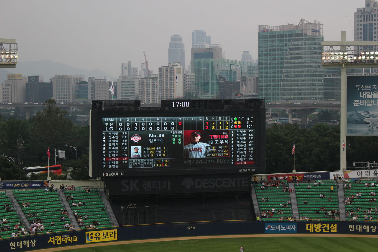 この球場はLGツインズと斗山ベアーズの2球団が本拠地にしている。昔はNPBでも東京ドームを巨人と日ハムが本拠地にしていた。日ハムと巨人はリーグが違ったが、KBOは1リーグだから日常的に対戦する。8日の試合は、まさにその試合だった。いわばソウルダービー。LGの主催試合。