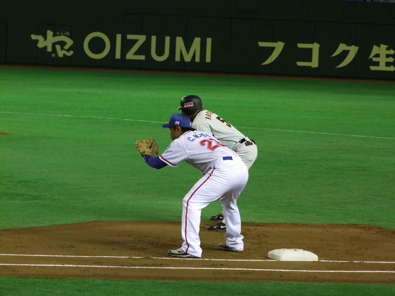 私は何度も見ている。これは2009年WBCのときに東京ドームで撮ったもの。なつかしや、アレックス・ラミレスが一塁走者だ。
