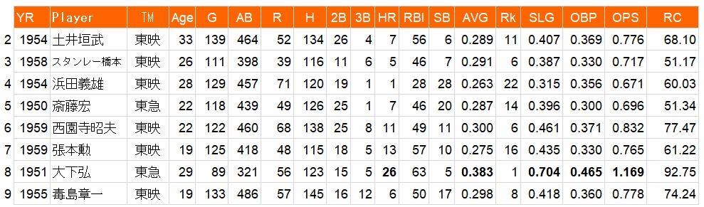 中堅はその大下弘。東急、東映時代は圧倒的な成績を残し続けた。
