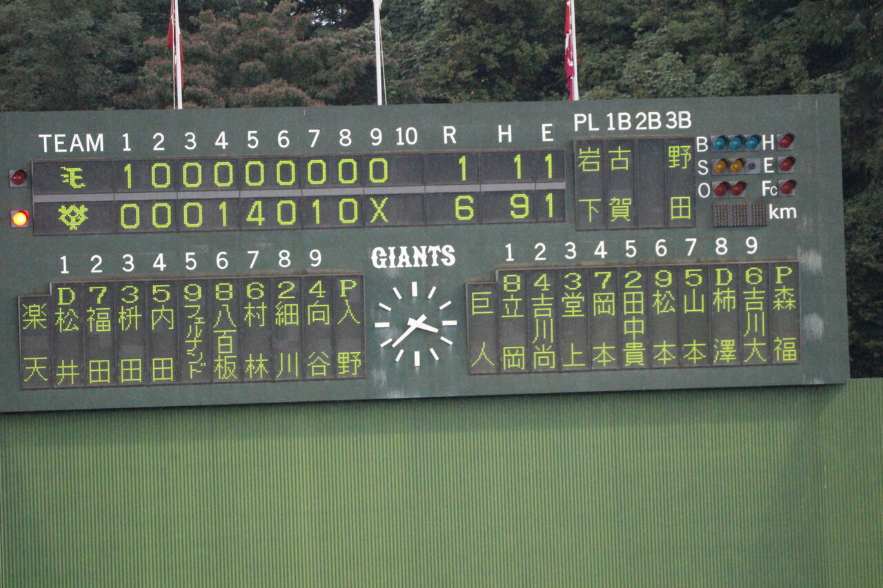 2017年9月16日の巨人、楽天戦のオーダー、出世前の岡本和真が4番を打っている。今はいない柿澤も。