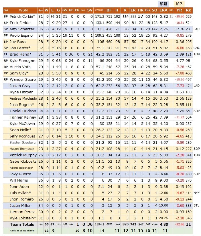 シャーザーは立ち直るも、チームはフラッグシップでドジャースに放出、ストラスバーグは開幕から復帰したものの6月には戦線離脱、コービンも不振を極め、偉大な先発投手陣は崩壊した。