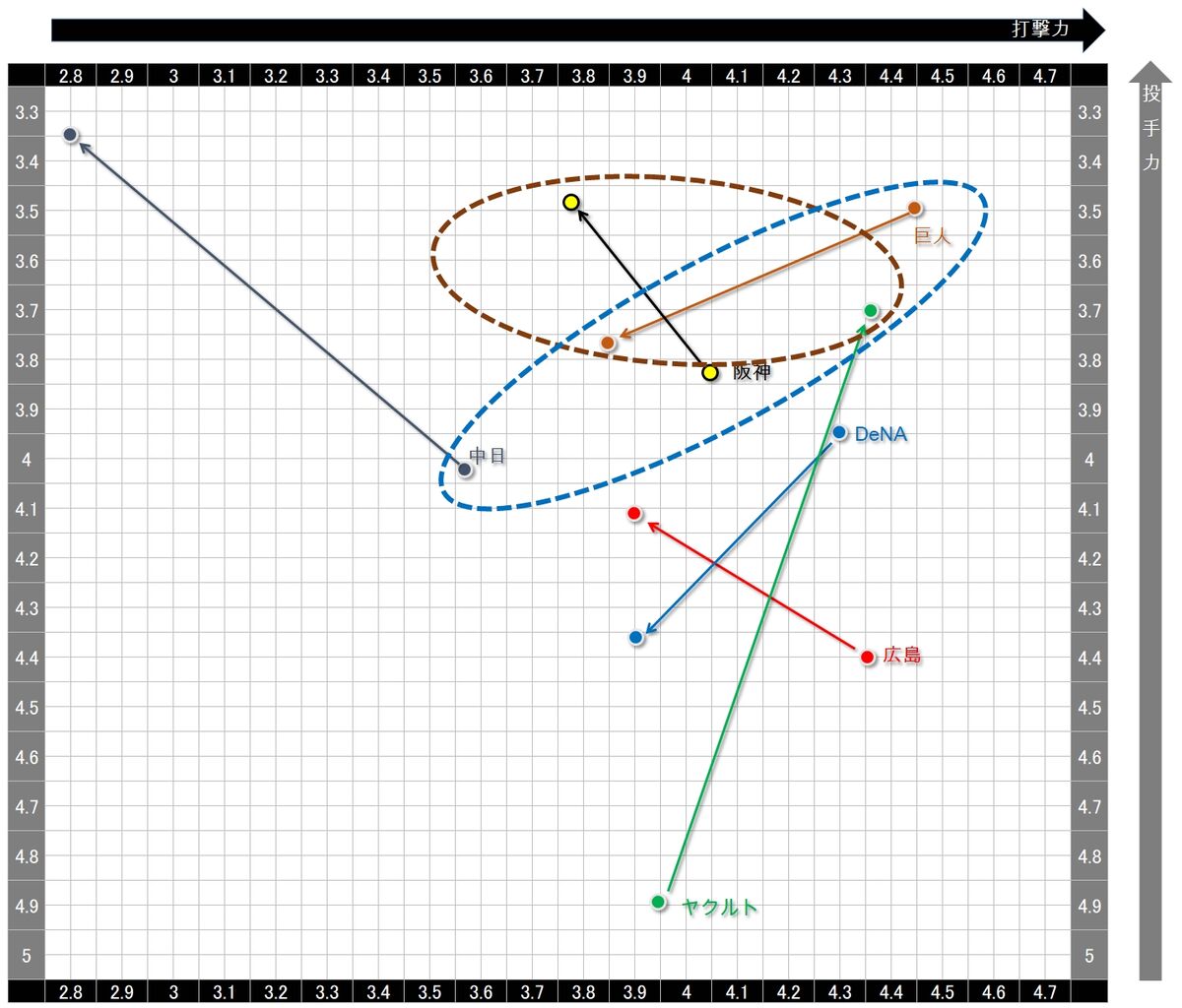左下から右上にポイントが推移すると投打の戦力向上、右上から左下が投打の戦力下落と言うことになる。