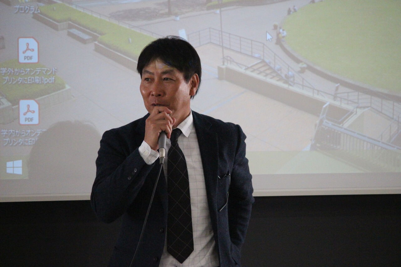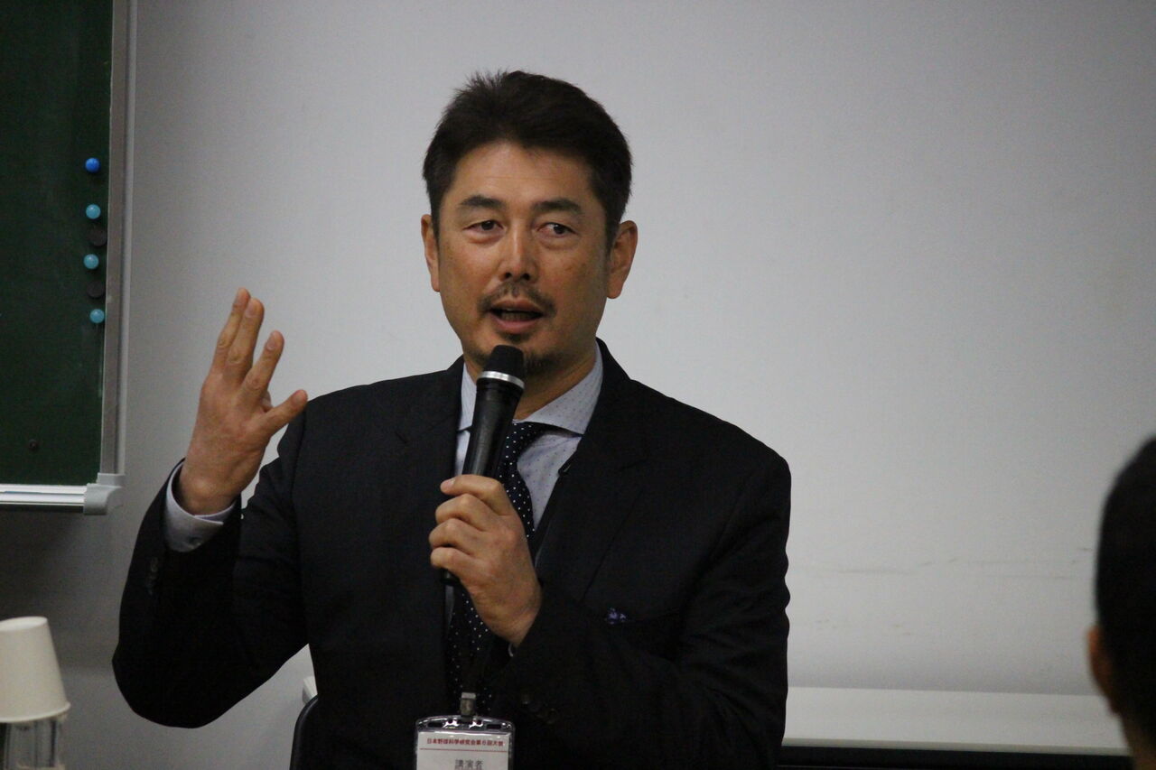 筑波大学では、恩師に当たる川村卓先生が総会を仕切っていて、吉井さんは投手のコンディション維持について講演した。そのときに筑波大大学院で学ぶ意味について聞いたのだが「オリンピック選手など他の分野のアスリートから練習法や指導法などいろいろ聞くことができて、視野が広がった」と語っていた。この時の吉井さん。
