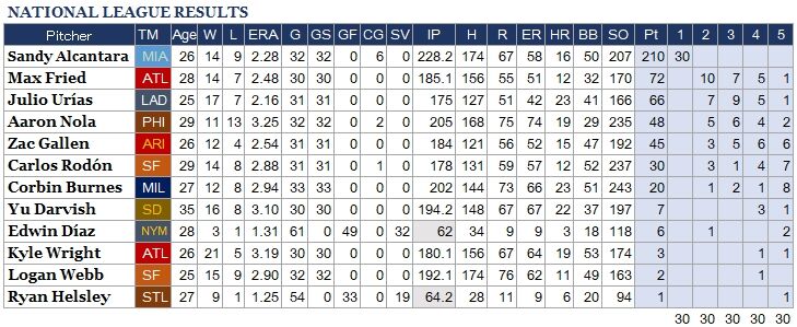 39歳の剛腕バーランダーが1位票を満票取って文句なしに選出される。旧来の指標である勝利数でも、勝率でも、防御率でも文句なしだ。イニング数はやや短いが、名人級だと言えよう。