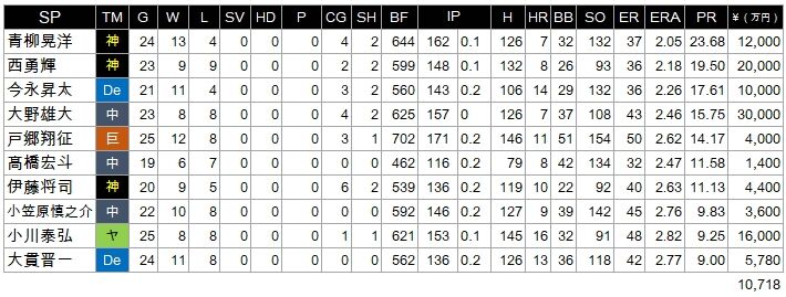 救援、先発でのPR(リーグ防御率に基づく総合指標)各10傑の選手の年俸ランキング、セ・リーグ。