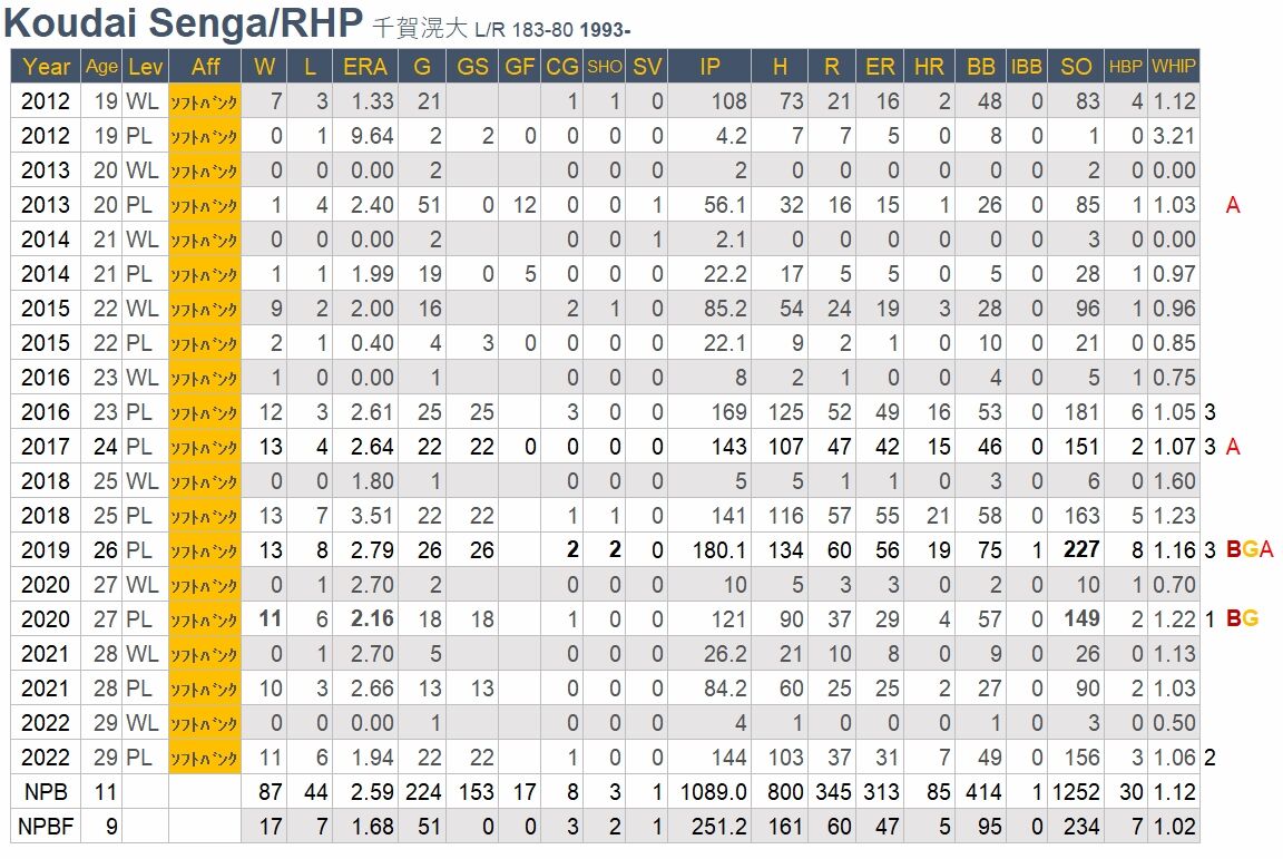 千賀滉大が山本由伸に次ぐ、パ・リーグのエースなのは間違いないところだ。そしてセにはそれほど優秀な先発投手がいないので、NPBのエース級でもある。