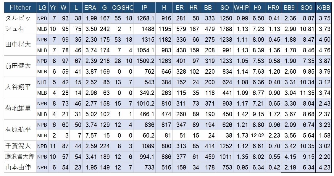 特にK/BBとBB9、K9の数字に注目する。NPB時代K/BBが3.5より小さい投手は、MLBでは1人をのぞいて成功していない。