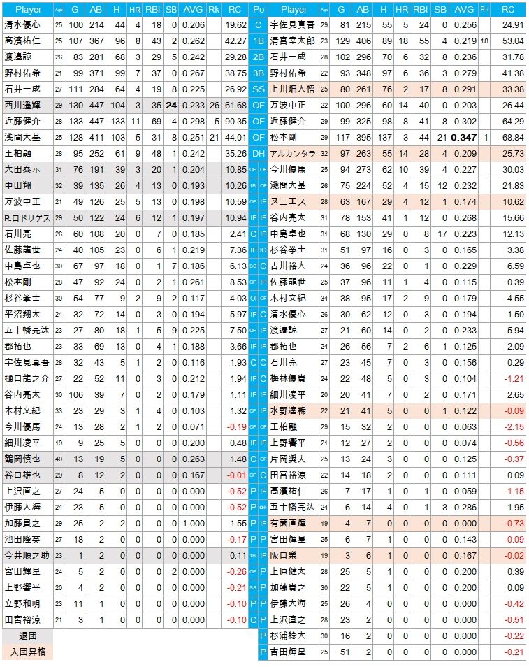 しかし打線のつながりは悪かった。清宮が規定打席に到達、本塁打、打点もチーム1位になったが、RCは53.04と対したことはなかった。ほとんど凡退で、たまに大きいのを打ったと言う印象だ。
