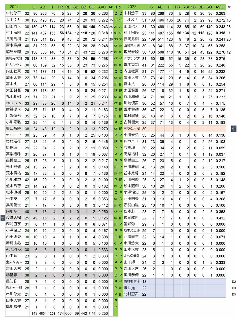 オスナは一塁守備も優秀で、信頼がおける右打者だが、サンタナはやや厳しくなっているか。青木宣親の衰えもあるし、外野にもう1枚、いい選手が出てこないといけないだろう。