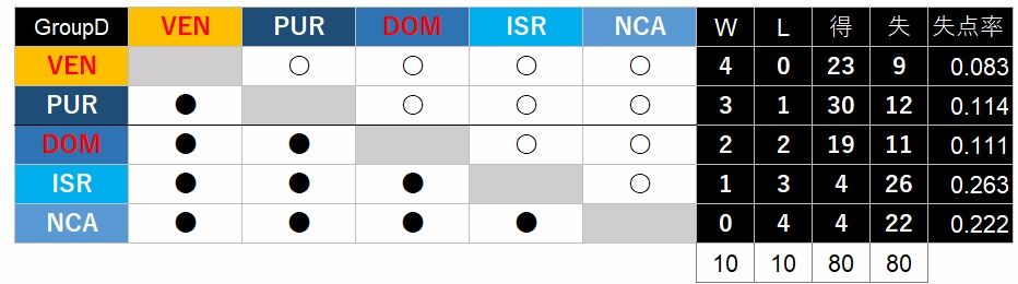 ドミニカ共和国とプエルトリコの最終戦。プエルトリコはクリスチャン・バスケスの本塁打、リンドーアのタイムリーなどで3回に4点を先制、ドミニカ共和国はファン・ソトの本塁打で1点を返すが、5回にリンドーアがまたタイムリー、裏にマチャドの併殺の際に1点と両チームが取り合って5ー2のまま、9回、プエルトリコのエドウィン・ディアズが3者三振で締めくくる。