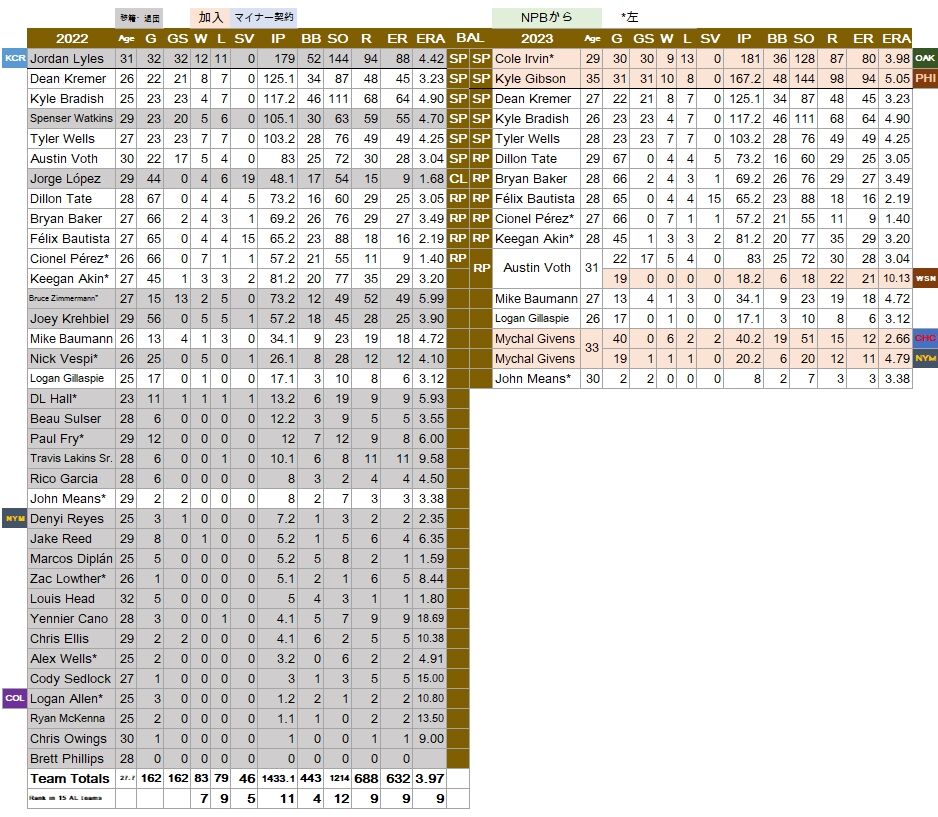唯一の二けた勝利のジョーダン・ライルズがロイヤルズに移籍。アスレチックスから左腕コール・アーバイン、フィリーズからカイル・ギブソンが加入。