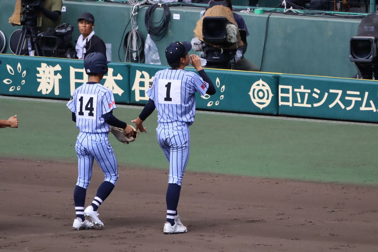 この試合でも6回に明豊の遊撃手、西川昇太の足がつって、審判が付き添ってベンチに戻る。