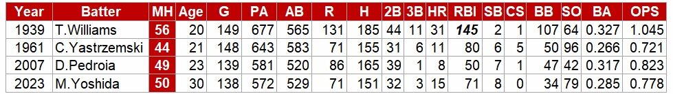 打撃の神様・テッド・ウィリアムスや、三冠王・ヤストレムスキーら生え抜きの好打者を輩出してきたレッドソックスのOBも、メジャー1年目には達成出来なかった数字。レジェンドを超え、吉田が金字塔を打ちたてた。