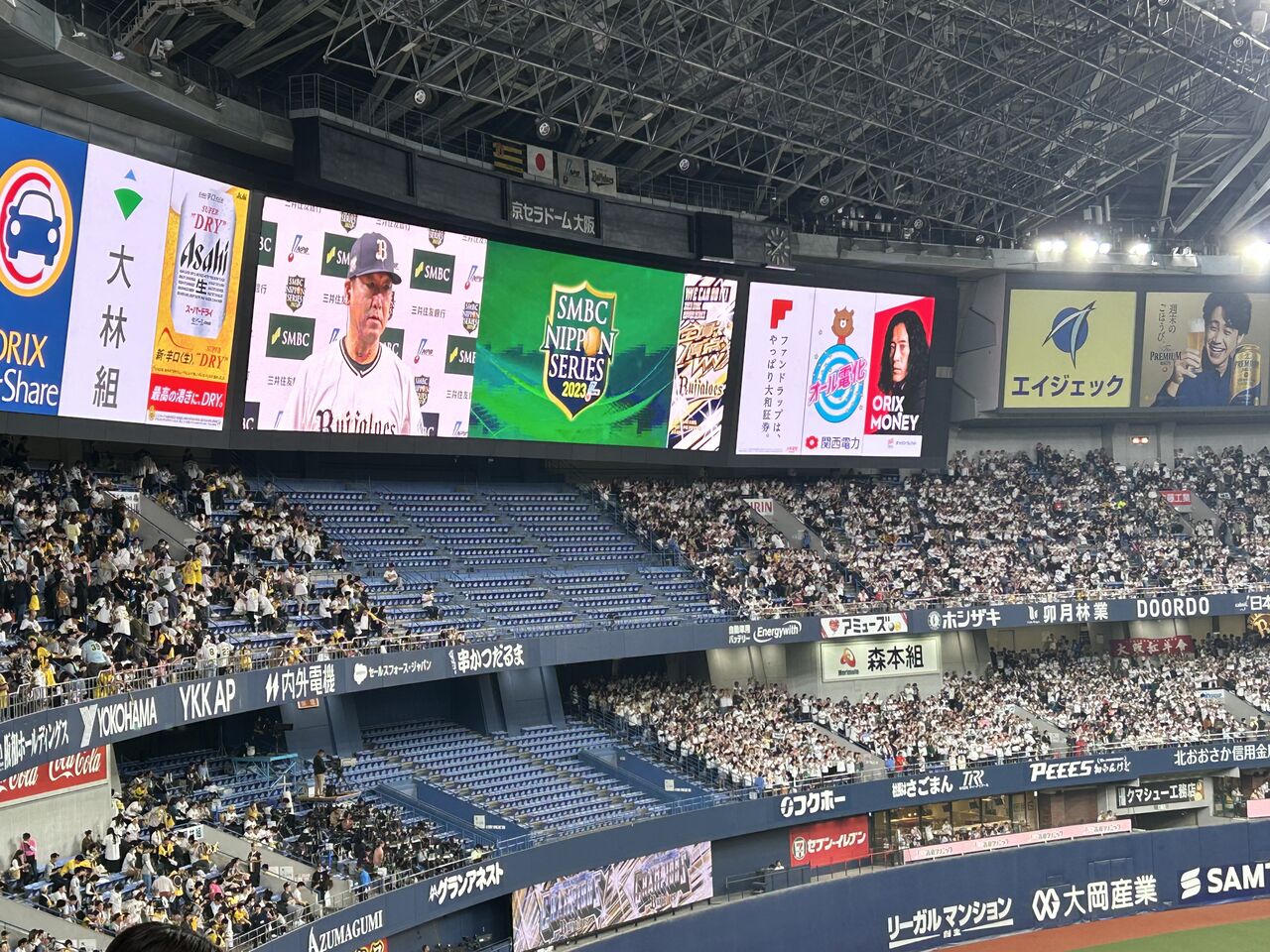 日本シリーズでは「満員御礼」は出ない。ペナントレースに比べて、京セラ、甲子園とも1000人以上少ない。主催が球団ではなくNPBで、年間指定席はなくなるし、見切り席など客席のカウントも違っているからか。