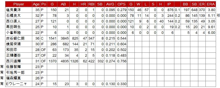 2016年10位の西口は2022年にセットアッパーとして34ホールドの活躍も、今年トミー・ジョン手術。育成で再契約する。