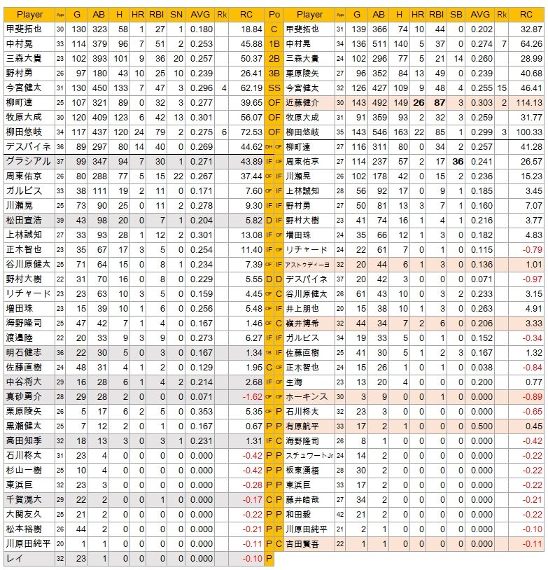 得点、打点は1位、チーム打率は2位、RCは1位。得点力はある打線ではあった。しかし藤本監督の采配のまずさもあったが、最後は失速したのだ。