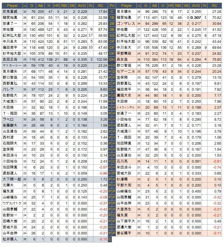 RCはリーグ3位、去年もそうだがソフトバンクに比べて強力な打線とは言えなかった。また吉田が抜けたことで四球数も激減していて、優秀とは言えなかったのだが。