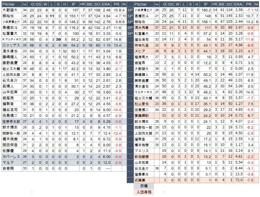 救援陣はジャリエル・ロドリゲスが亡命したが、ライデル・マルティネスは故障で離脱するまで圧倒的なクローザー、これに藤嶋、勝野、育成上がりの松山、新鋭斎藤綱と、素晴らしい中継ぎ陣ではあった。