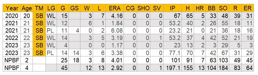 球団はこの逸材を慎重に起用し、2021年に一軍デビュー、この頃から制球難が目立ち始め、2022年は一軍出場なし。