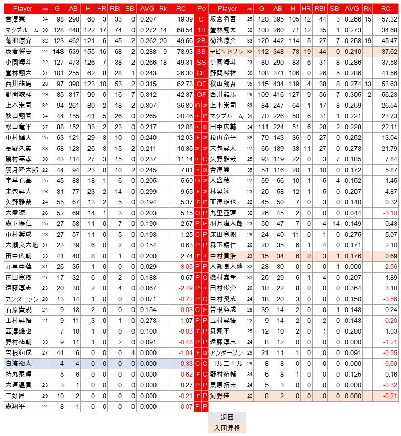 しかし昨年の中心打者、坂倉が捕手へのコンバートもあってかRCが大幅に減少。それに次ぐマクブルームも小型化。西川は打率2位になったが、RCは減少した。