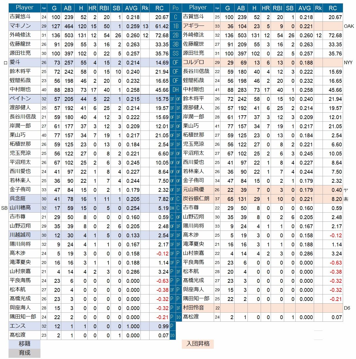 昨年規定打席に乗ったマキノンが退団。これはかなり痛い。さらに愛斗と主力級が2人いなくなった。