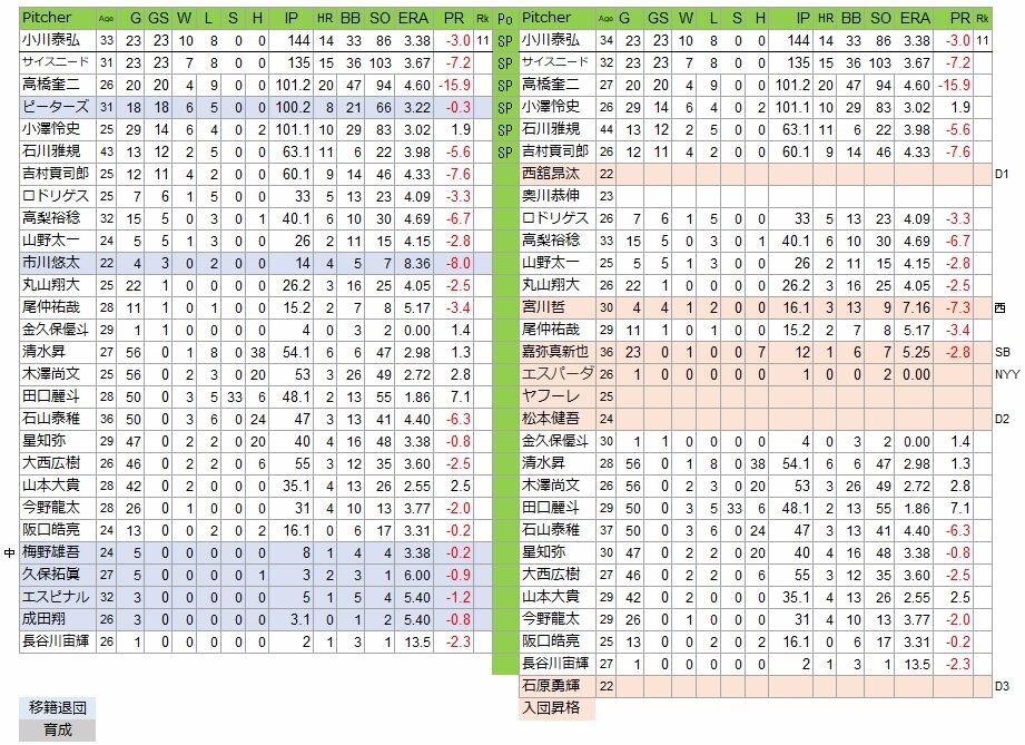 先発投手陣は、そのまま1歳年を取った形だ。小川、サイスニード、高橋というローテはそのままだろうが、小川も相当勤続疲労がたまっているような感じではある。