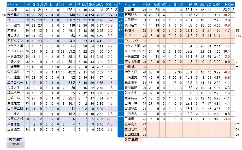 今永がカブスにポスティング移籍、バウアーも去就が決まらない。バウアーの場合、まだ帰ってくる可能性はあるが、2人合わせて278.2イニングをどうして埋めるかという問題がある。