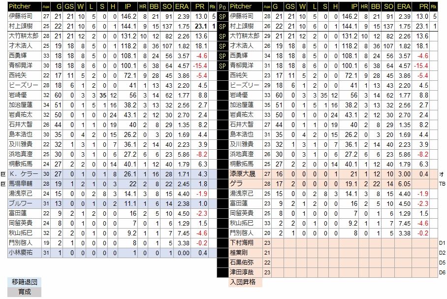安定感のある左腕の伊藤将に加え、村上、大竹が素晴らしい成績。才木もほぼローテを維持した。