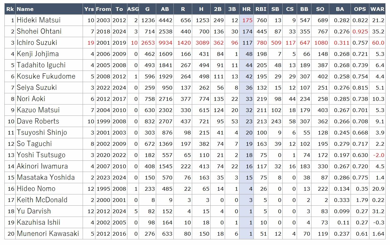 このデータでは日本生まれの「外国人」も入っている。だから現ドジャース監督のデーブ・ロバーツが10位にいたりする。また投手も野茂英雄、ダルビッシュ有、石井一久と3人いる。