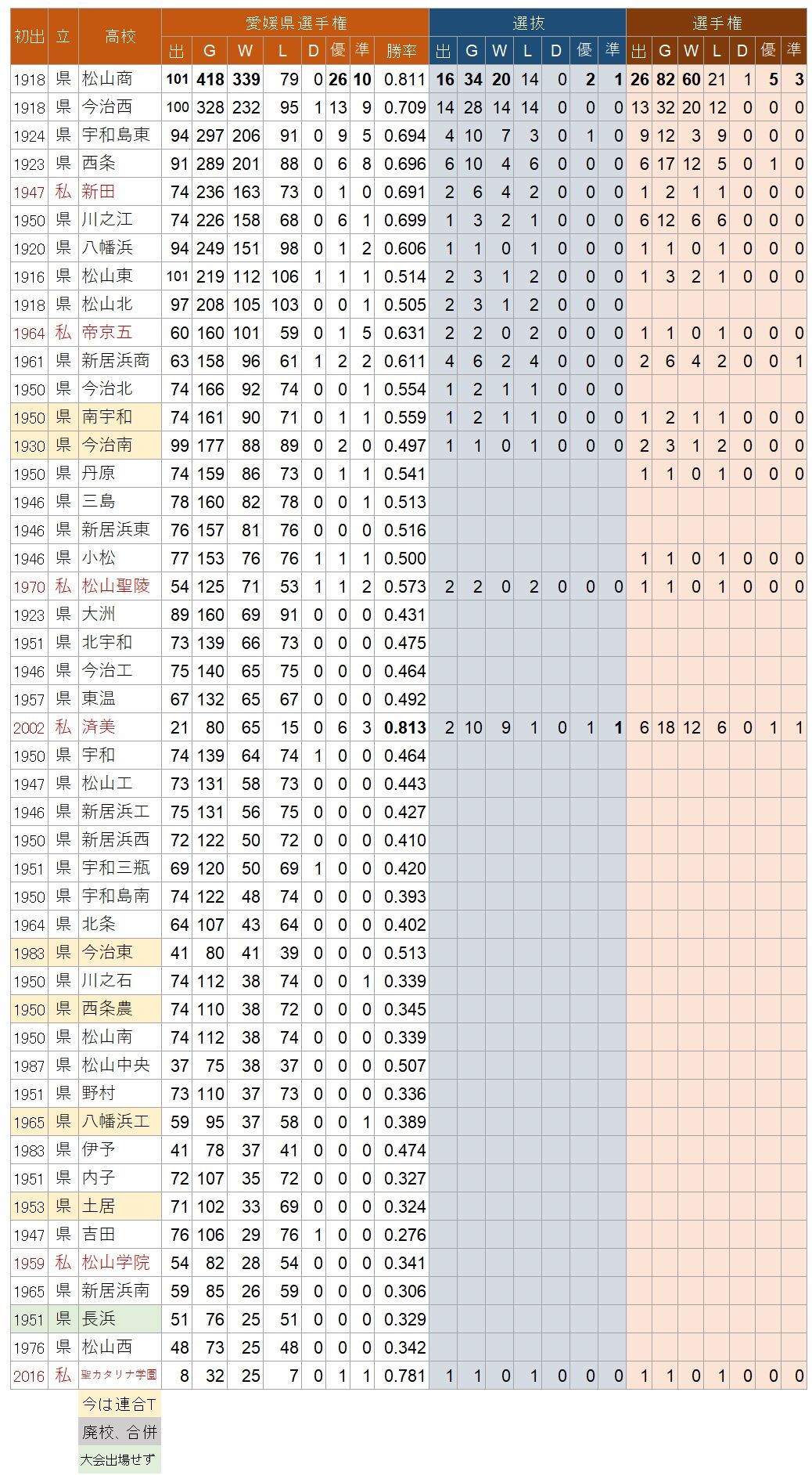 選手権大会の勝利数と勝率、優勝、準優勝。春夏の甲子園の成績もつける。まずは勝利数47位まで。