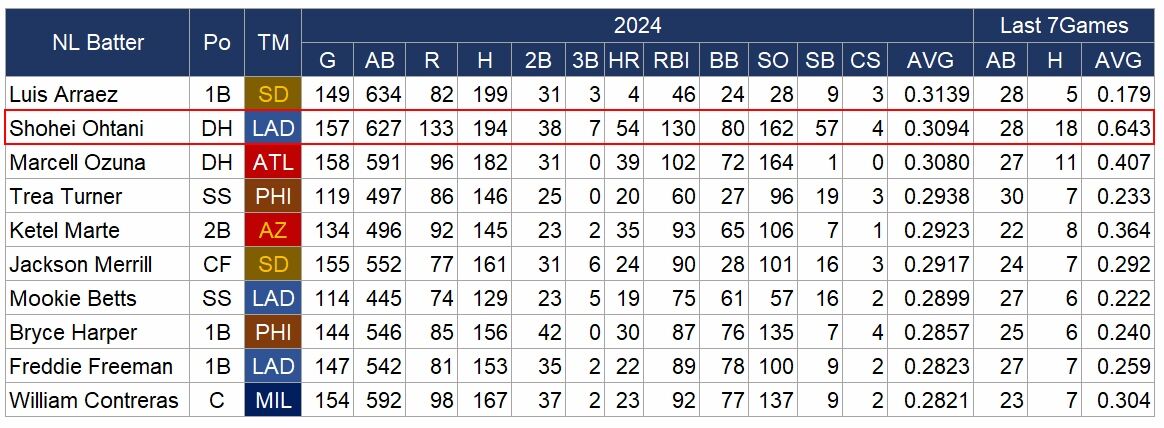 現時点でのナ・リーグの打率ランキング 直近7試合の打率もつけた