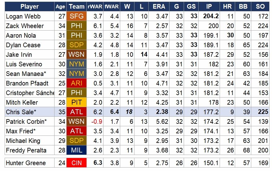 今年のナ・リーグの先発投手。投球回数順に15傑