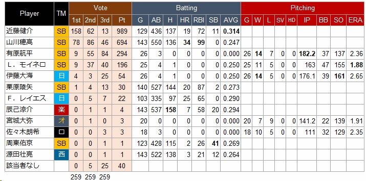 NPBのMLBの選考の基準は「チームの優勝に貢献した選手」が最優先のはずだ。今回のソフトバンクの圧勝を考えれば、3冠王とかNPB記録が出たのでなければ、日ハム選手に1位票を入れるのはあり得ないだろう。